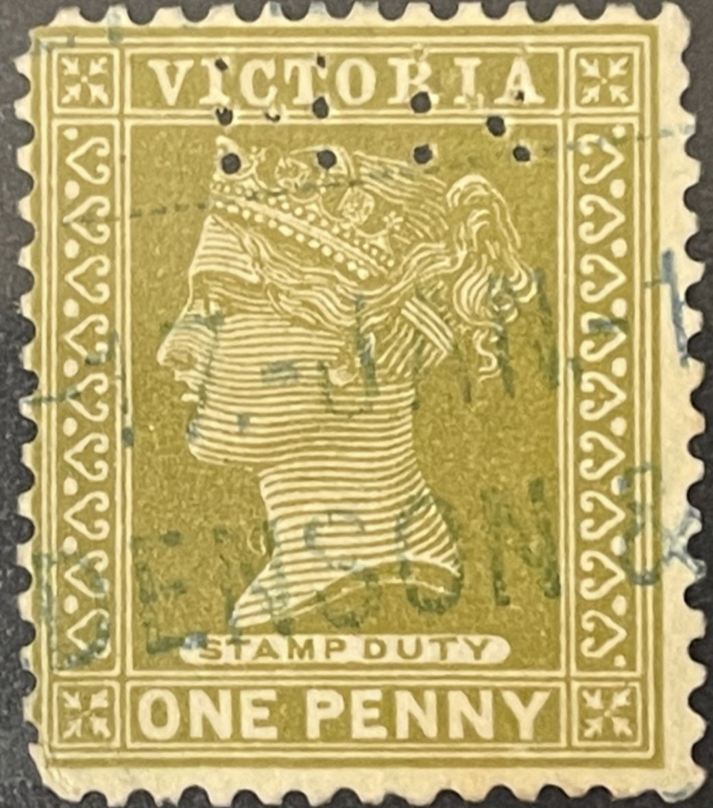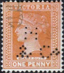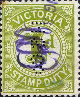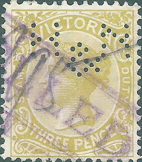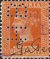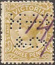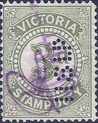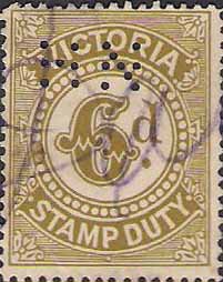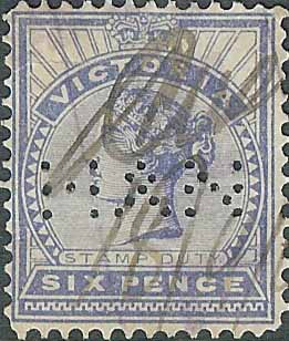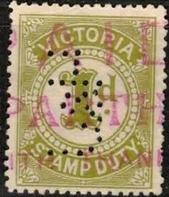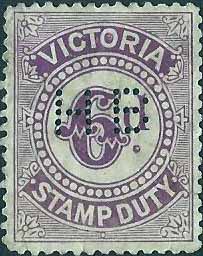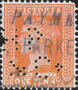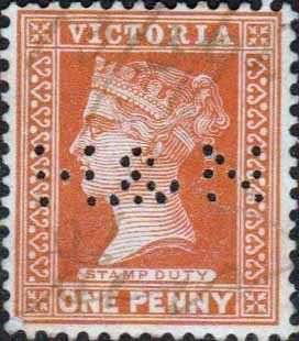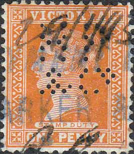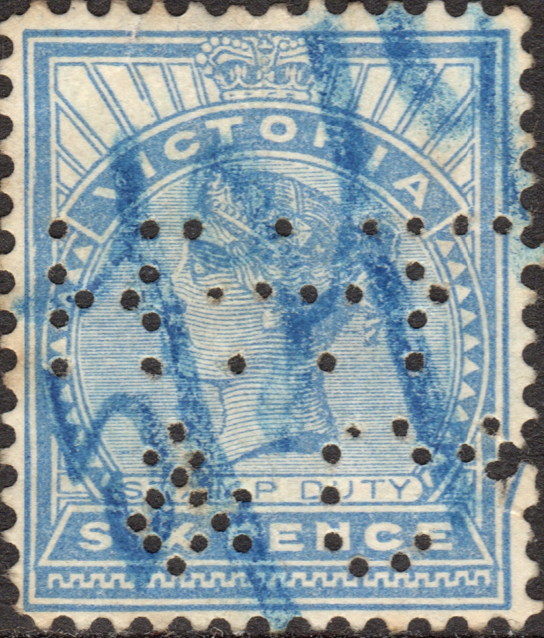Background: See HP&Co.a above Device: The HP/&Co.b pattern is made from a temporary die in a single die format. Such devices, which could produce these temporary patterns, were used by some Stamp Vendors in Melbourne from late 1800’s and early part of the 20th Century. This pattern is extremely rare and there are only 2 settings of the pattern reported. They differ in the separation between the four component letters. However only 1 setting is reported on revenue stamps which is most likely due to this usage being much less common than use on postage stamps. The pattern is reported in its various layouts over the period around 1895. The company were infrequent users of temporary perfin patterns and all of their patterns are rare and especially rare on revenues. Related Patterns: refer to other Huddart Parker patterns in: VIC: HP/&Co.a (above) *State Library of Victoria * Huddart Parker Offices 466 Collins St, Melbourne, VIC -------------------------------------------------------- HS.a