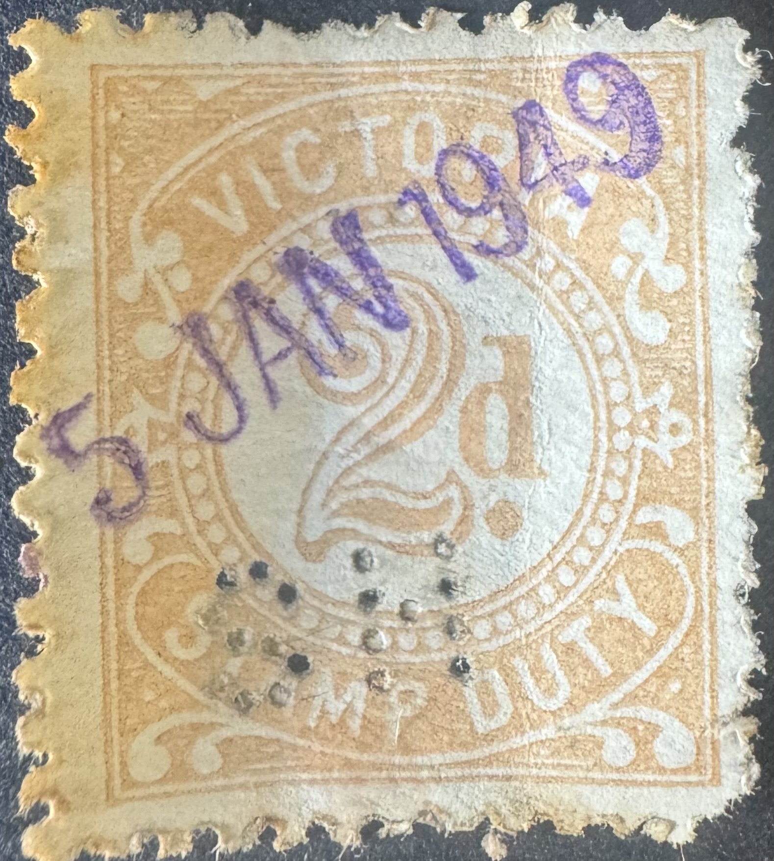 User: Holdenson & Nielson Dairy Produce Merchants Address: 521 Flinders St, Melbourne, VIC Revenue Use: 1902 Series 6d (Bistre) Rarity Scale: