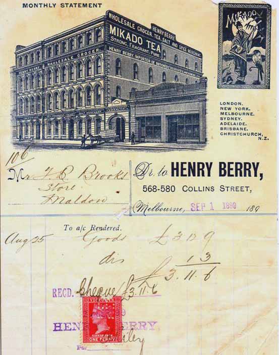 Soon Berry was the sole owner and he expanded the business and was the first in Victoria to attempt the manufacture of salt from local deposits. His factory at Cundare, near Colac, absorbed £10,000 before he admitted defeat. Berry later developed the important deposits at Edithburgh, Yorke Peninsula, which were amalgamated with others at the end of the century to form the Castle Salt Co-operative Co. In 1878 Berry opened a branch of his general merchandise business in Adelaide. Other branches followed in New Zealand 1885, Sydney 1890, Brisbane 1891, and Perth 1896, and he later opened offices in London and Toronto. In 1879 his brother Howard joined the firm and Berry's son, Henry Parton May, became a partner in 1888. By 1899 Berry employees numbered six hundred in Australia and New Zealand.