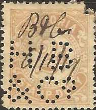 1911 Series 1d R3 Device: The HSCO.a device came into service in about 1905 and remained in use until at least 1915. The HSCO.a device is most likely a single die customised device. The associated HSCO.a pattern is found on revenue and postage stamps with usage across Australia supported by postmark evidence, including, Sydney, Newcastle, Perth, Fremantle, Brisbane, Rockhampton, Maryborough, MacKay, Townsville, Cairns, Adelaide, Port Pirie, Petersburg, Murray Bridge, Port Adelaide, Melbourne and Geelong. The strikes found used in the various remote locations are essentially identical, so it is difficult to say if they were a series of identical dies in separate devices or a device located centrally (most likely the head office in Melbourne) which perforated stamps for dispatch to user areas. The central location would have faced the challenge of obtaining revenue and postage stamps of the various States and receiving these and returning them to user areas. More likely that the devices were a series of identical located at least in the main State office in each State. This argument for remote but similar devices, is supported by the fact that company subsequently replaced the HSCO device(s) with a range of devices of similar appearance in the HSLD format and that these devices were allocated to their various remote offices around Australia. Related Patterns: refer to other Howard Smith patterns in: NSW: HSLD.a