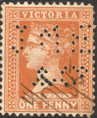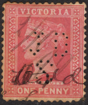 Address: (unknown) Revenue Use: 1880 Series 4/-, 6/- Rarity Scale: 1880 Series 4/- R4, 6/- R4 Background: This may have dual use as a security perfin or a cancel of convenience. This perfin is also recorded on GB revenues. Buyer beware. Device: Single Head Related Patterns: Nil --------------------------------------------------------