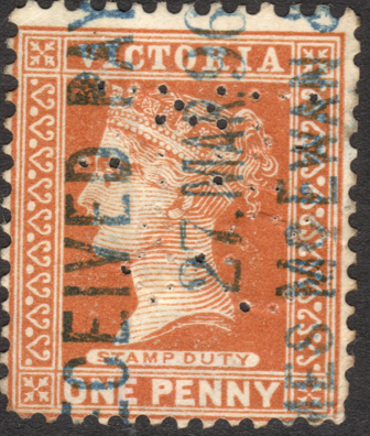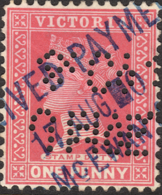 User: J Danks & Son (unconfirmed) Engineers Address: 391-403 Bourke St, Melbourne, VIC Revenue Use: 1886-1899 Series, inscribed 'STAMP DUTY' 1d (Shades) Rarity Scale: 1886-1889 Series 1d