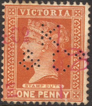 Background: *George Eastman started experimenting with photographic technology in the late 1870’s and formed the Eastman Dry Plate Company in London in 1881. Eastman pioneered film on rolls and this revolutionised the photography industry. The business grew quickly to become Eastman Kodak Company by 1892 with a web of related companies in the United States, Canada and throughout Europe. Kodak Australasia was formed in 1908 by the merger of Kodak with the Victorian based Baker and Rouse Pty Ltd who had operated the Austral Plate Company since 1884. The Kodak production facilities were located at Abbottsford in Melbourne but they operated retail and distribution offices in Sydney, Brisbane, Perth and Adelaide. Notably Baker and Rouse were also perfin users with a B&R pattern found on postage stamps between 1906 and 1910 but this pattern has not been found on revenues to date. Device: This K.a device is a single die device that was initially located in Perth from the early 1920’s. See K.a in the Western Australian Chapter. It is confirmed as a single die device by the fact that in multiples the strikes do not show any consistent relationship to each other. Furthermore the K.a device is able to produce single and central strikes on stamps of a variety of sizes. It was first used in Perth in the early 1920’s but in around 1925 the device seems to have been moved to Melbourne and all subsequent usage is in Melbourne. Perth usage on revenue stamps is scarce. In Melbourne the device was also used on revenue stamps of Victoria as well as the postage stamps of Australia.