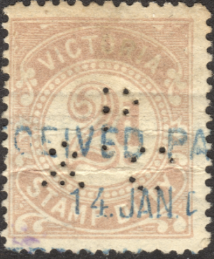 In September, 1892, Thompson was advertising himself as “late of Pentland, Roberts and Thompson” commenced practice in the Older Fleet building in Collins Street and attending Williamstown Court two days a week. In May of the same year, he had tried practising at Maryborough, apparently without success. By December, 1892, he was working at Catterall and Shallard’s practice in Footscray. Thompson was sued by a client in 1894 and again in 1911. James Ratu Thompson died insolvent in 1923. In previous studies of Australian Private Perfins this pattern has been only provisionally assigned to the user Pentland, Roberts & Thompson. However our study of their revenue use shows that the usage of high values and the frequency of revenue cancellations from the Titles Office and similar, provides enough evidence that the user is a Solicitor. Furthermore the history of the company and its name changes sits very well with the usage period of the device. Device: The PRT.a device is a customised single die device. This can be confirmed by the fact that it is found with single and central strikes in stamps of various formats.
