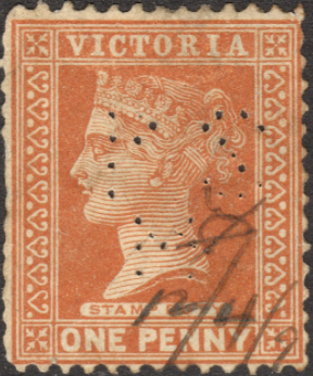 1886-1899 Series 1d R4 Background: See PL/&B.a above Device: As noted in PL/&B.a above, Patterson Laing and Bruce were major perfin users and there are more than 30 different patterns attributed to them. Most of these were used in Melbourne and most were Temporary Punctures. That is temporary dies created to apply a pattern to a stamp purchased from a stamp vendor.