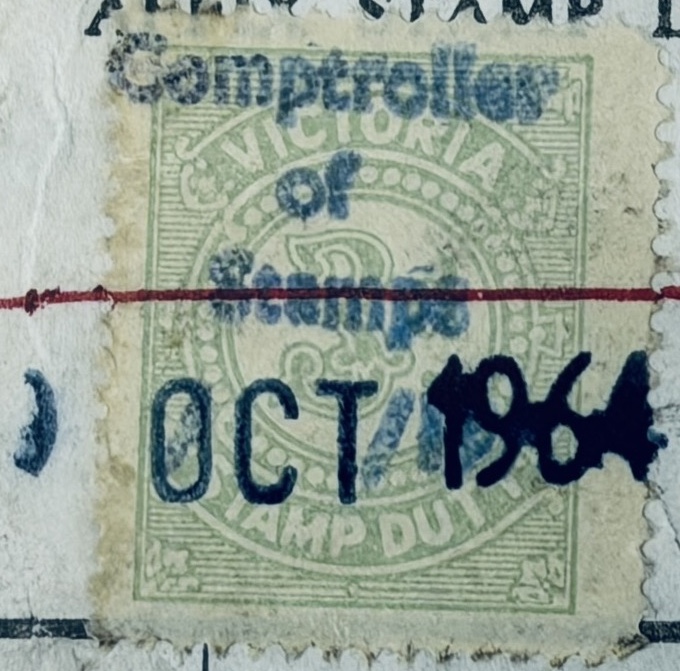 1886 Series 1d R4 Background: Daniel G. Cullen was in business as a mercantile broker he was elected to Hawthorn Council in 1882, becoming Mayor in 1887 serving on the Council for many years. In May 1882 he was on the initial board of management of the Australian Co-operative Tobacco Factory Co. Ltd and an agent for Warrenheip Brewery, which he held for a number of years. By June 1888 he was described as a commercial broker and a major shareholder in the new Property Building Finance and Investment Society of Australia Ltd. He moved to Williamstown in about 1890. In early, 1923, Cullen sold 6 lots [total] 120 acres of freehold farm land [by Crown Grant] and 3 acres near the railway station in Darnum [in Gippsland] apparently reducing his business activities, he died in 1928. Device: Handstamp Related Patterns: Nil -------------------------------------------------------- C. M. L..a User: Colonial Mutual Life Pty Ltd Insurance Address: St, Melbourne, VIC Revenue Use: 1966 Series 3c Rarity Scale: