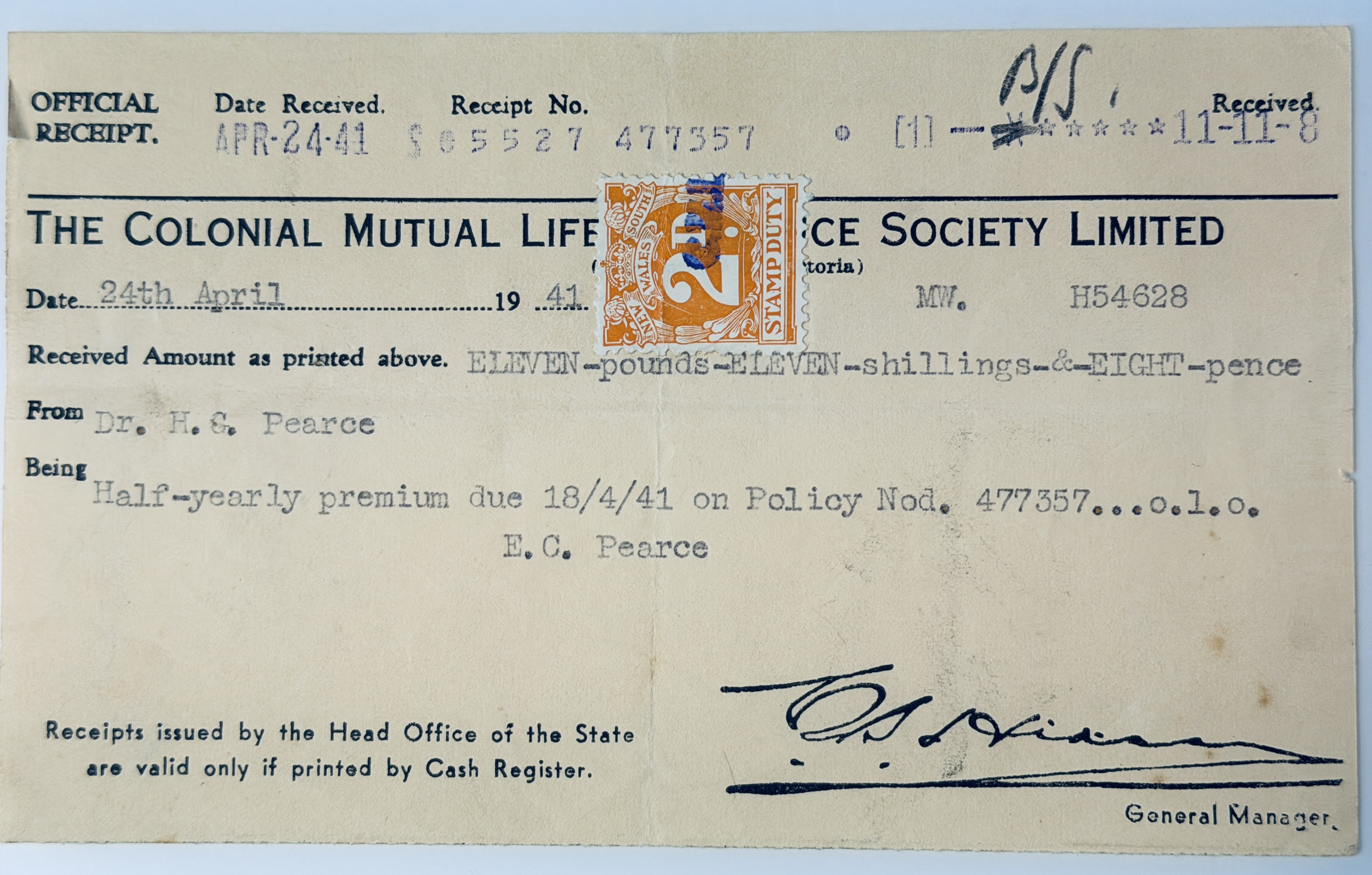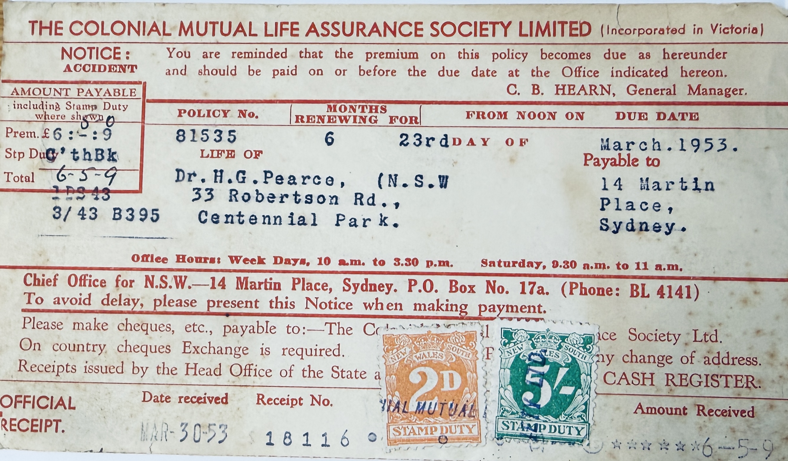 .a .b User: The Colonial Mutual Life Assurance Society Limited Insurance Provider Address: Revenue Use: 1929-66 Numeral issue 2d [.a], 10/-[.b] Rarity Scale: 1929-66 Numeral issue 2d[.a] R4, 10/-[.b] R4 Background: See CMF.a in the Perfin section