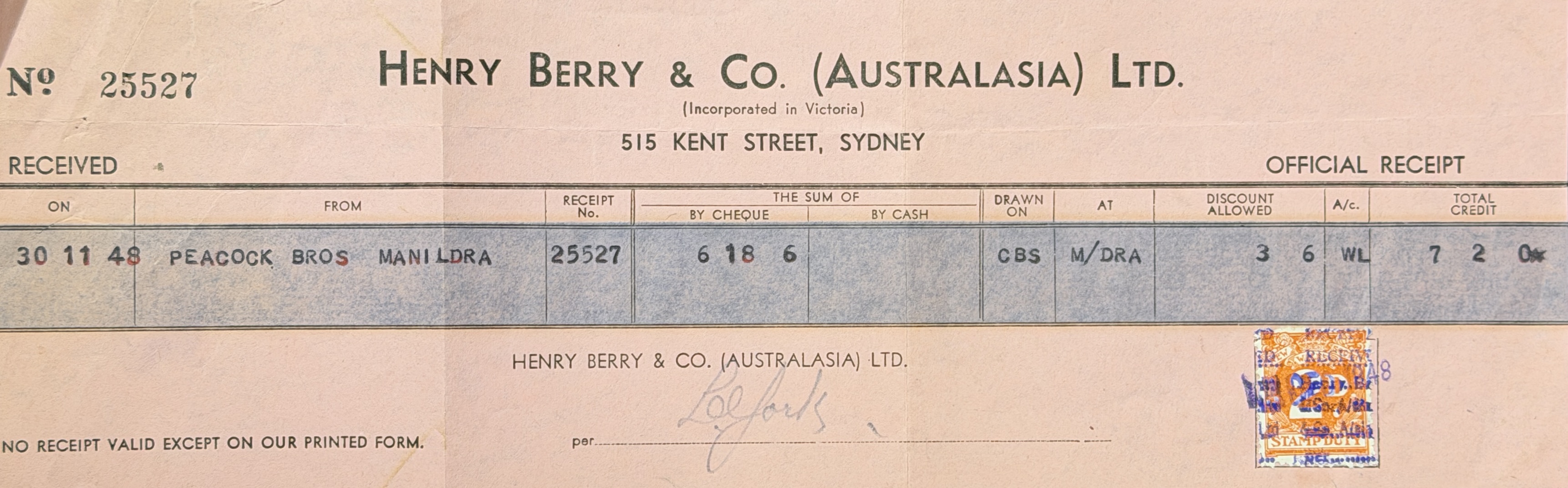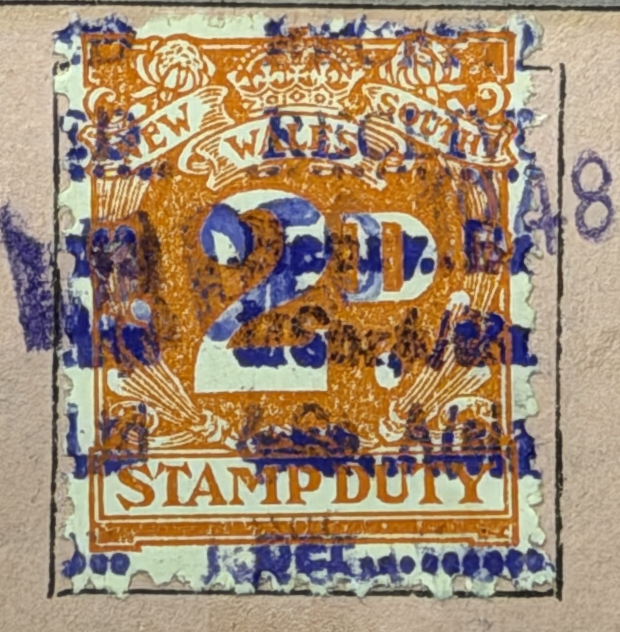 Address: 515 Kent St, Sydney, NSW Revenue Use: 1929-66 issue 2d Rarity Scale: 1929-66 issue 2d R4 Background: Device: Handstamp Related Patterns: Nil